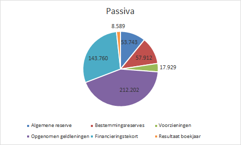 In de grafiek passiva is te zien dat de gemeente haar bezit voor het overgrote deel financiert met aangetrokken leningen (schulden). Op zich is dit gebruikelijk; wanneer je een huis (bezit) koopt financier je dit vaak ook via een hypotheek (schuld). Het is wel van belang om in de gaten te blijven houden wat de omvang van de schulden zijn in relatie tot het eigen vermogen (de reserves).